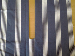 You need to then mark the centre of the opening where you want the zip to go. Attach a small piece of iron on interfacing to the bottom of the cut as above . Measure the width of the zip tape and mark a fold line both sides of the centre cut. You need to make sure that the opening us not too wide for your zip. Mark a triangle running out from the end of the cut to the end of the seam allowance as shown. Cut these lines too, making sure they match