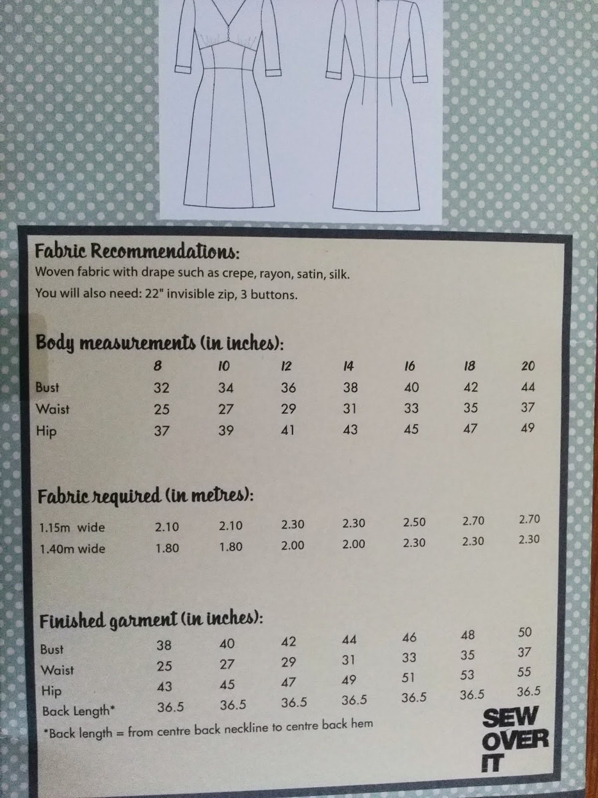 This is a typical pattern of the era. Softly feminine, knee length and demure. We were told to use "cheerful coloured fabrics with a small print so that no pattern matching was required"