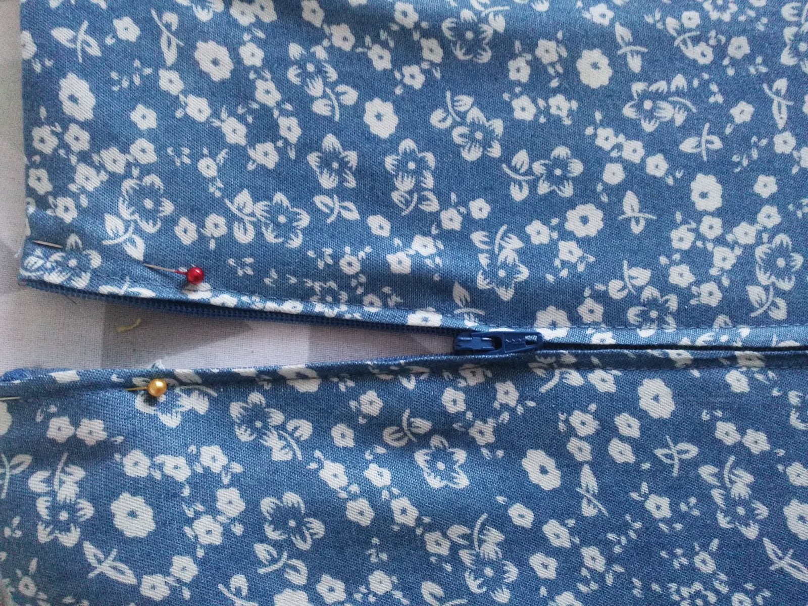 Firstly lay the zip face down over the seam with the teeth exactly in the centre of the back opening and pin it in place.