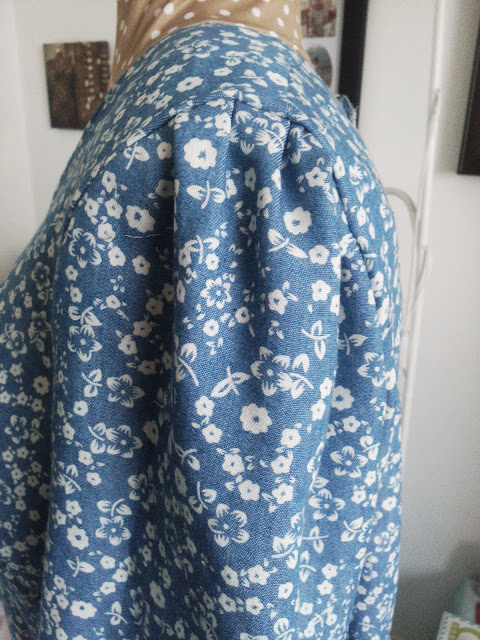 The pattern doesn't mention this but the sleeves look better and are more authentic gathered at the top instead of being eased in. To do this measure 2" both sides of the shoulder and run two rows of gathering stitches inside the seam allowance. Gather to fit.