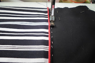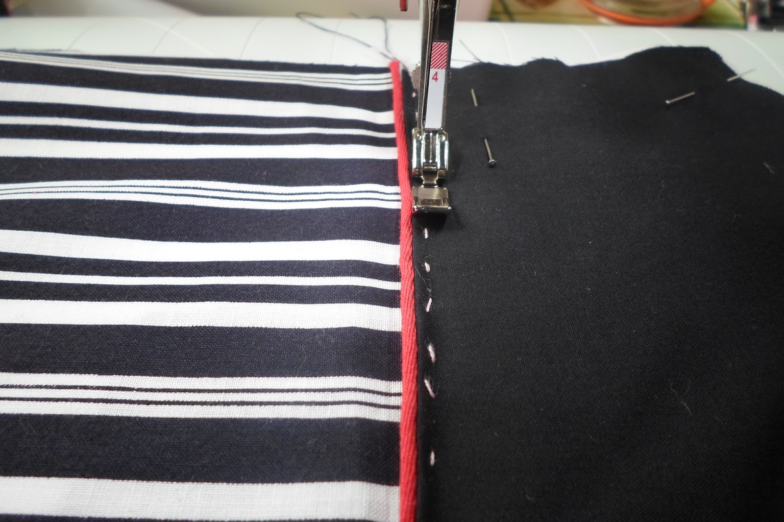 I have cut the main body of the shirt in the striped cotton but I want to add some interest so I have cut out front and back yokes in plain black.The yokes are going to be edged with red piping. Turn under the seam allowances at the bottom of each yoke piece. Press.