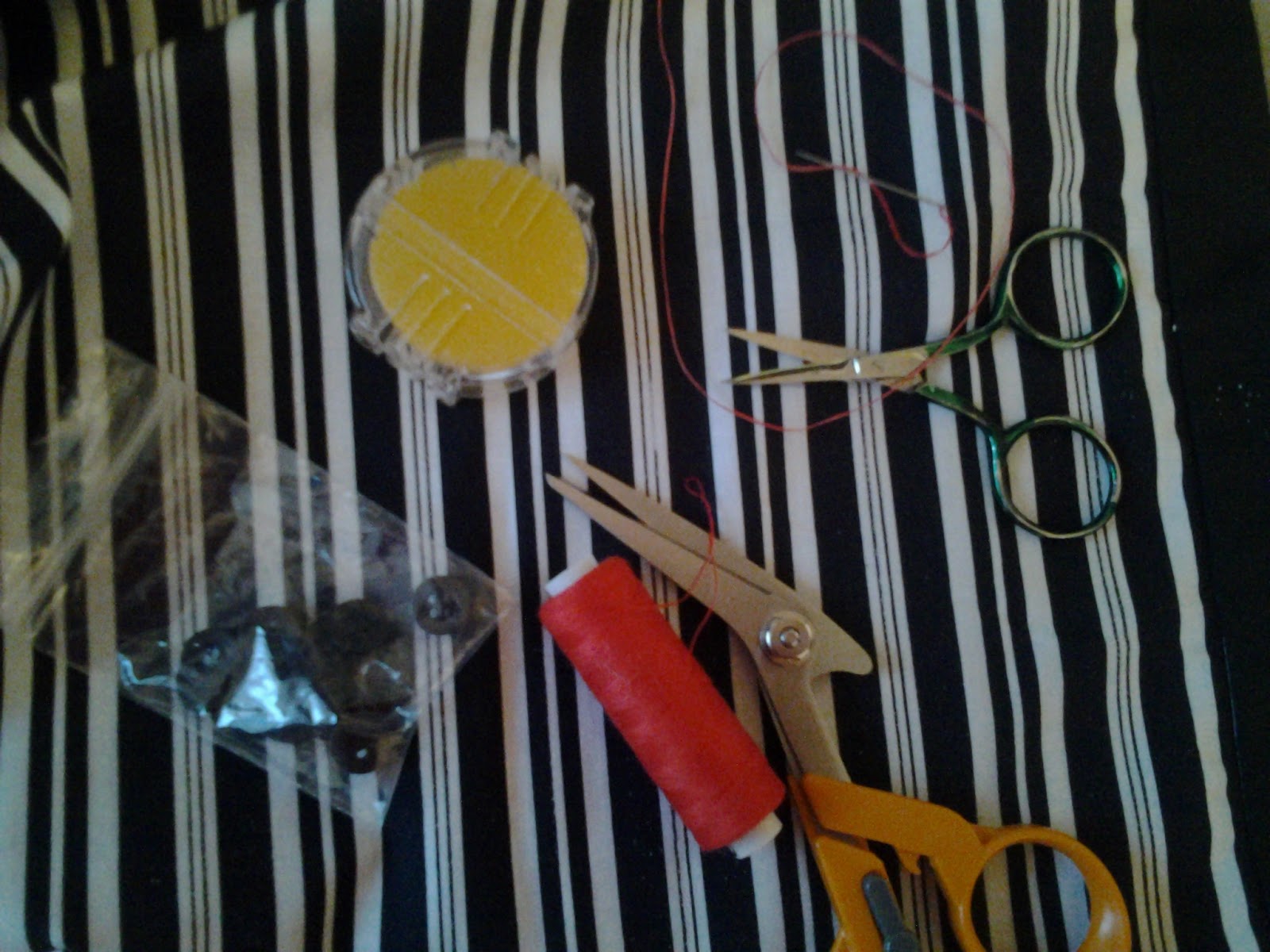 Mark the positions of the buttons with chalk and gather together your equipment. I sit at the dining table and spread my work out for this bit.
