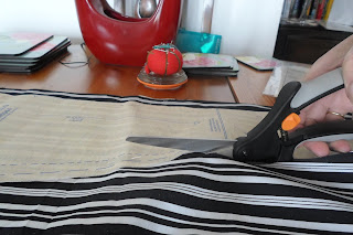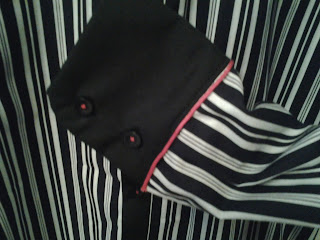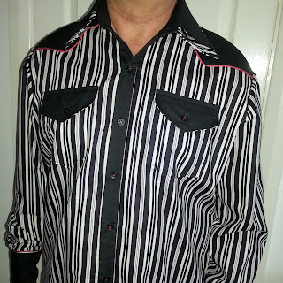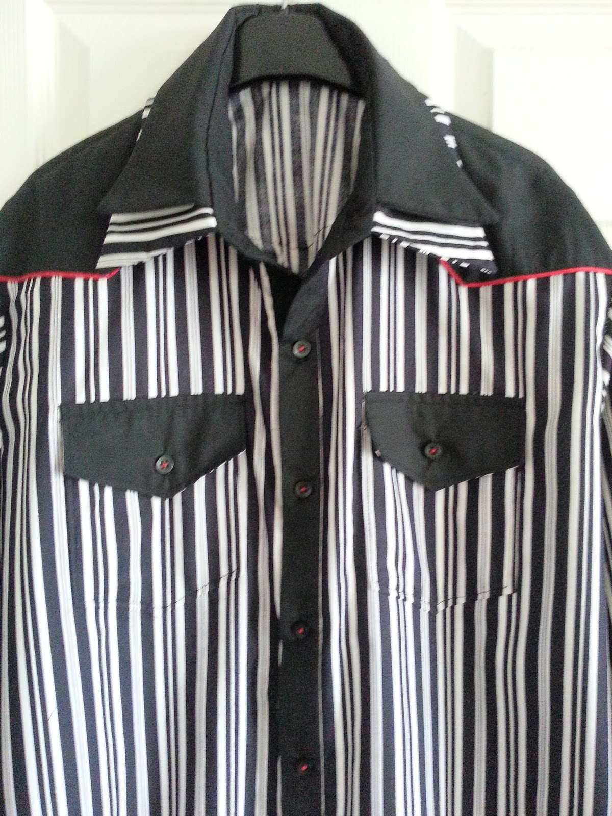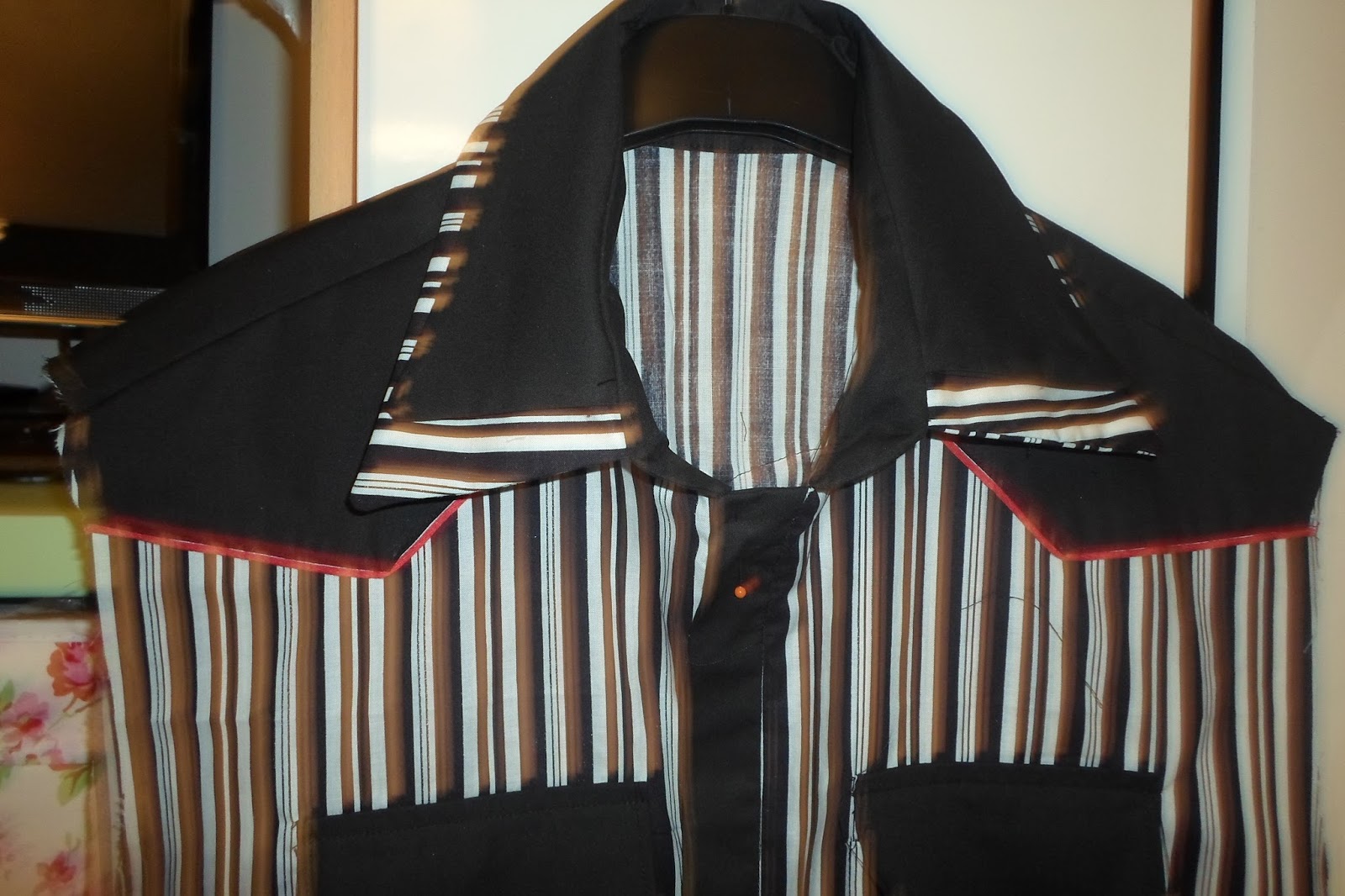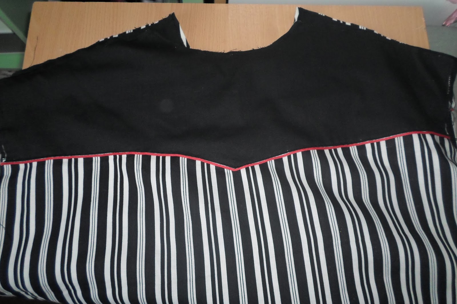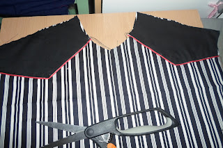 I am using two different cotton fabrics, one in an uneven black and white stripe and a plain black. I will also be using some red piping. The pattern is a very old one which I have adapted and changed many times to make different variations of the shirt. I have made over a dozen shirts so far and no two are the same.