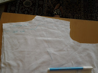 The very first thing I did was to make a toille of the bodice. I used some lightweight cotton fabric and transferred all the pattern markings onto it with a fabric marking pen.