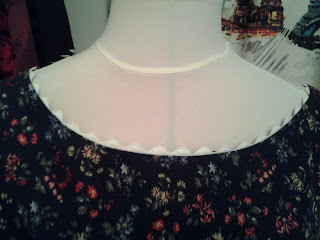 I ironed on some interfacing to the facings and overlocked the edges. Join the facings at the shoulder seam and place the facing on the bodice right sides facing.