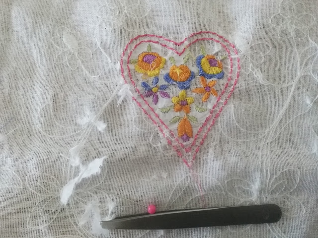 I chose a heart design for on the sleeves and on the bottom of the right front. This is the reverse side as you can see I am picking away at the residue of stabiliser with a pin and some tweezers. It is very easy to remove