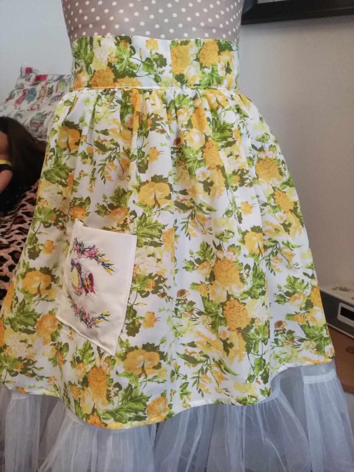 I turned my embroidery into a pocket by hemming the top and turning the sides in, mitering the corners. Position on the apron and stitch down on three sides. Press.