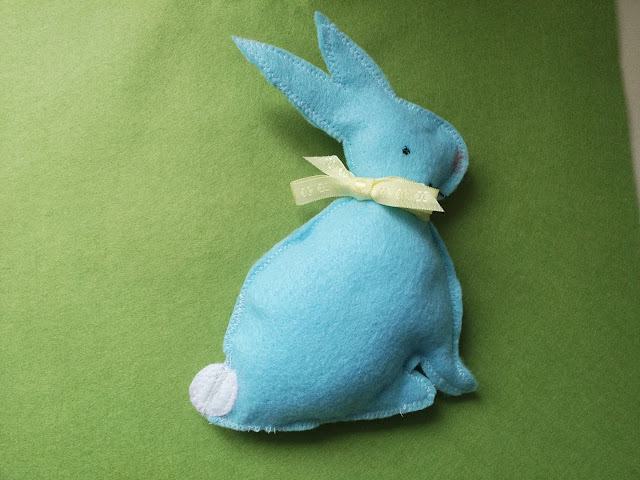 Stitch around the three sides of the bag with a zig zag stitch or by hand with some embroidery thread and a small running stitch.Fill with sweets and chocolates and maybe a small felt Easter Bunny like the one below
