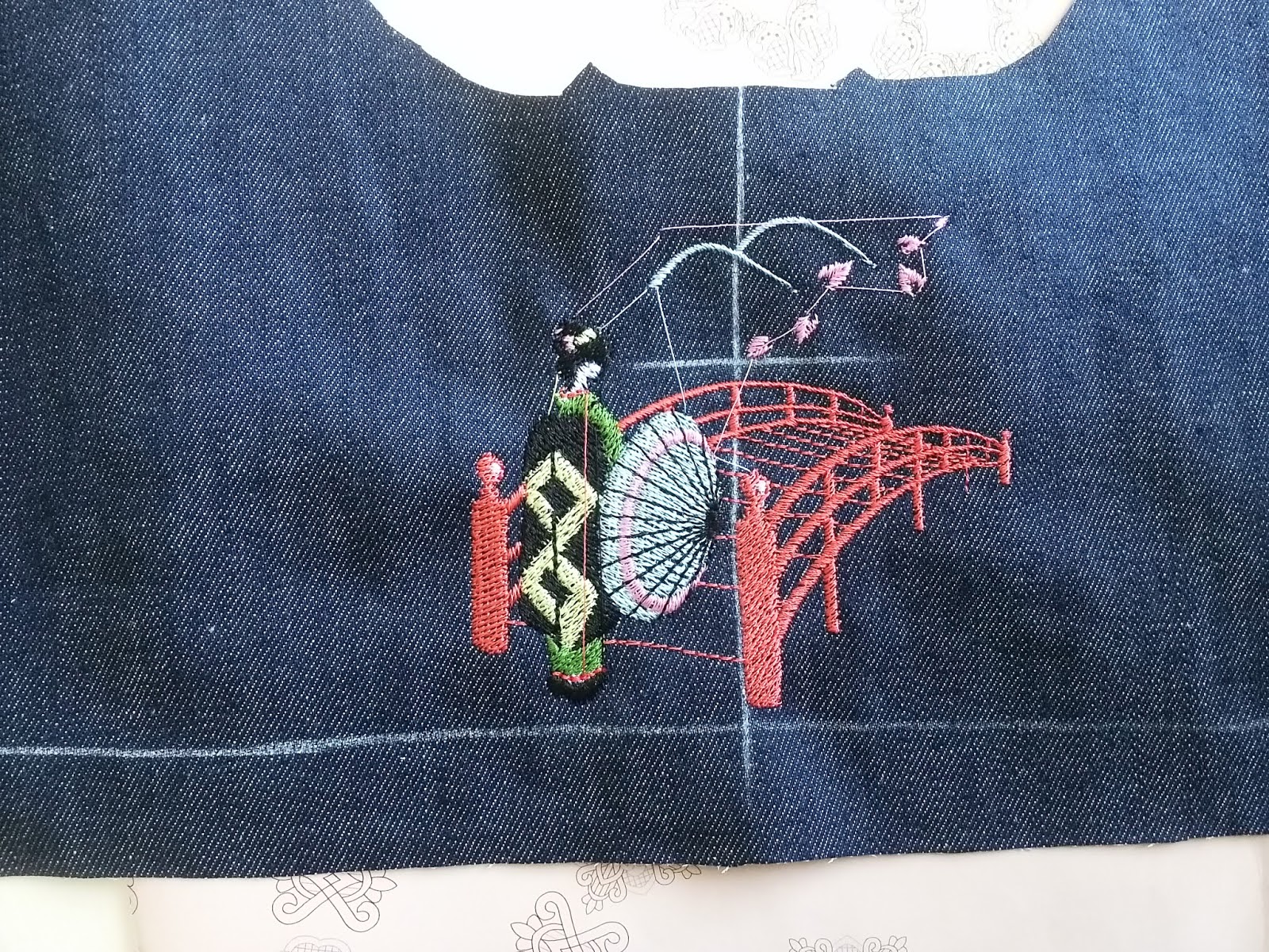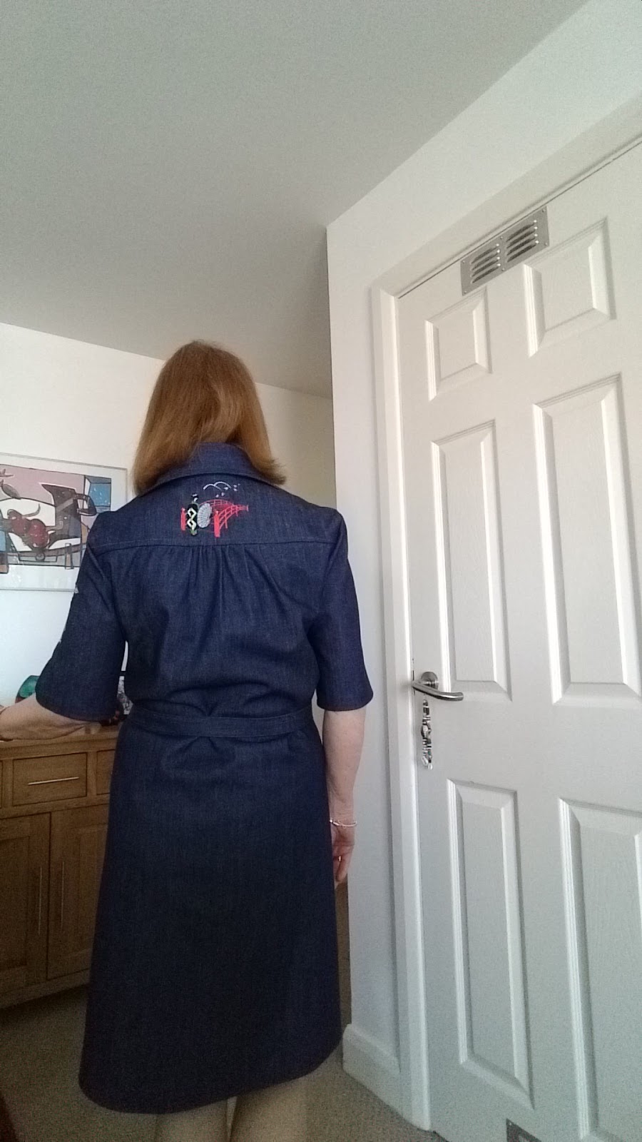 I made a very simple tie belt out of the same fabric. If I made a plain denim dress I may well have worn a contrasting coloured leather belt with it instead.The top and the bottom Geisha girls are actually the same design, I just changed the colours which was easy to do.If you are just doing a small amount of embroidery then a top stitch around the front and collar in a colour to match one of the embroidery colours would look nice