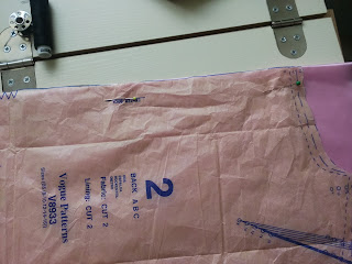 Press, do not iron the interfacing onto the front facings.Use a hot iron and a damp cloth always - never press directly onto fabric when using wool. Keep the iron in one place lifting it and moving to the next spot without sliding the ironjoin the facing to the side lining .press ( Press every seam as you go is the rule for this project)Then stitch the dart as before. This is the only difficult part of the pattern so take your time and if you want to you can stitch it in sections. This is where you will appreciate all the tailors tacks you put in earlier.stitch the side seams in the lining.