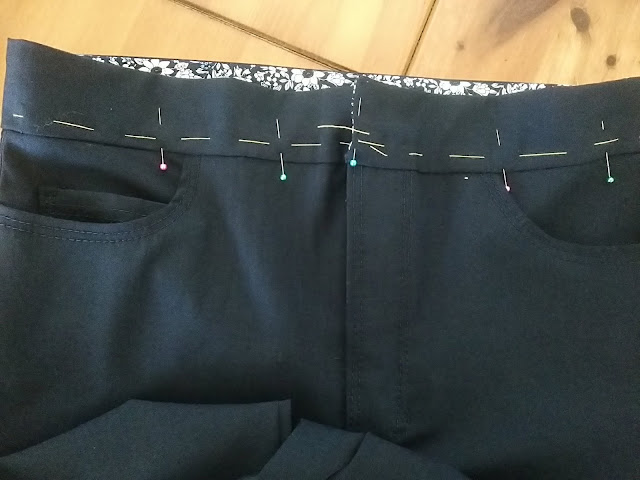 The third option if you like a firmer waistband - as I do - is to cut out the top piece in denim, and interface the cotton lining with a medium interfacing.