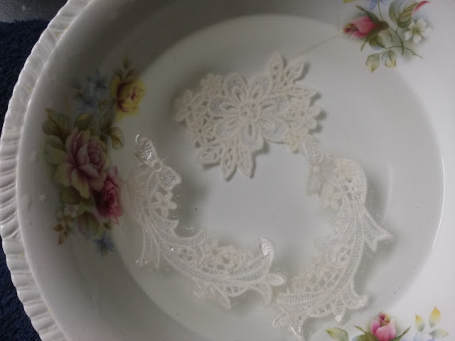 Once you have finished your lace ( don't forget to mirror the design if you want it on both sides of a neckline etc) trim away as much stabiliser as possible and soak it in cold or tepid water. This will get rid of the stabiliser. You will need to change the water a few times, if it is still too stiff then a gentle wash will remove any which remains. It is more durable than you imagine and once it is stitched in place will happily whiz through your wash cycle.