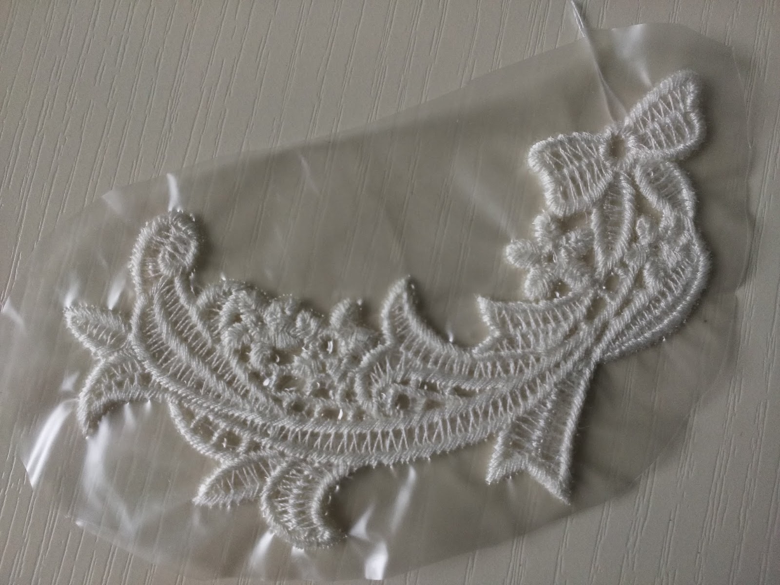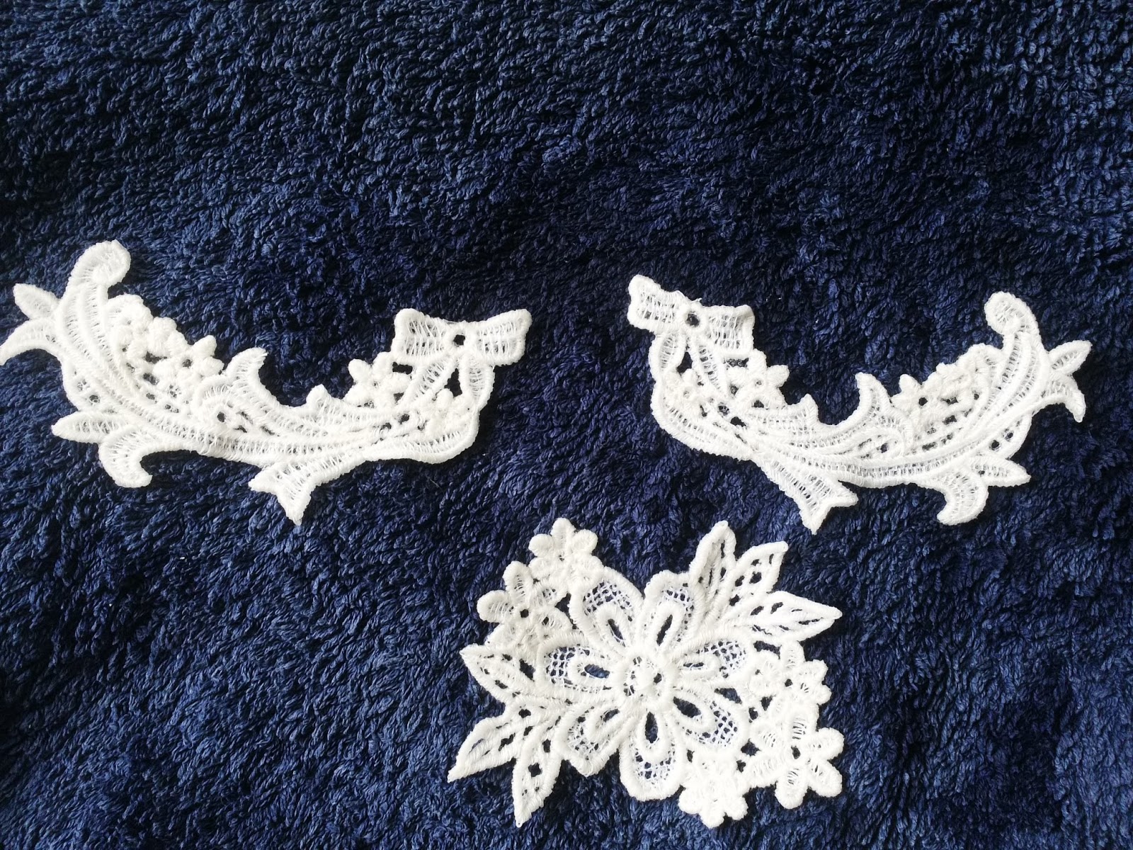 I stitched the lace motifs on using a regular sewing machine. I used an open toe foot and a small zig zag. Before stitching, I placed the motifs where I wanted them and held them in place with some temporary adhesive.