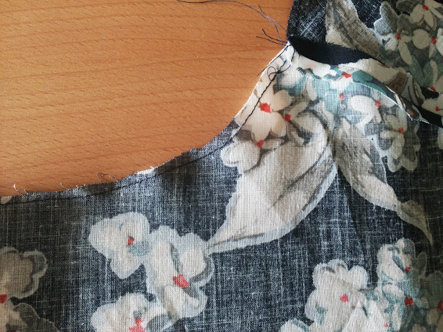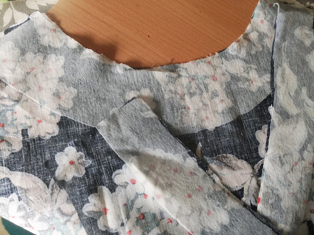 I like to get all the preparation out if the way first so the very first things I did was to stay stitch around the neckline on the bodice,this stops the neckline from stretching out of shape. Stay stitching is done just within the seam allowance.