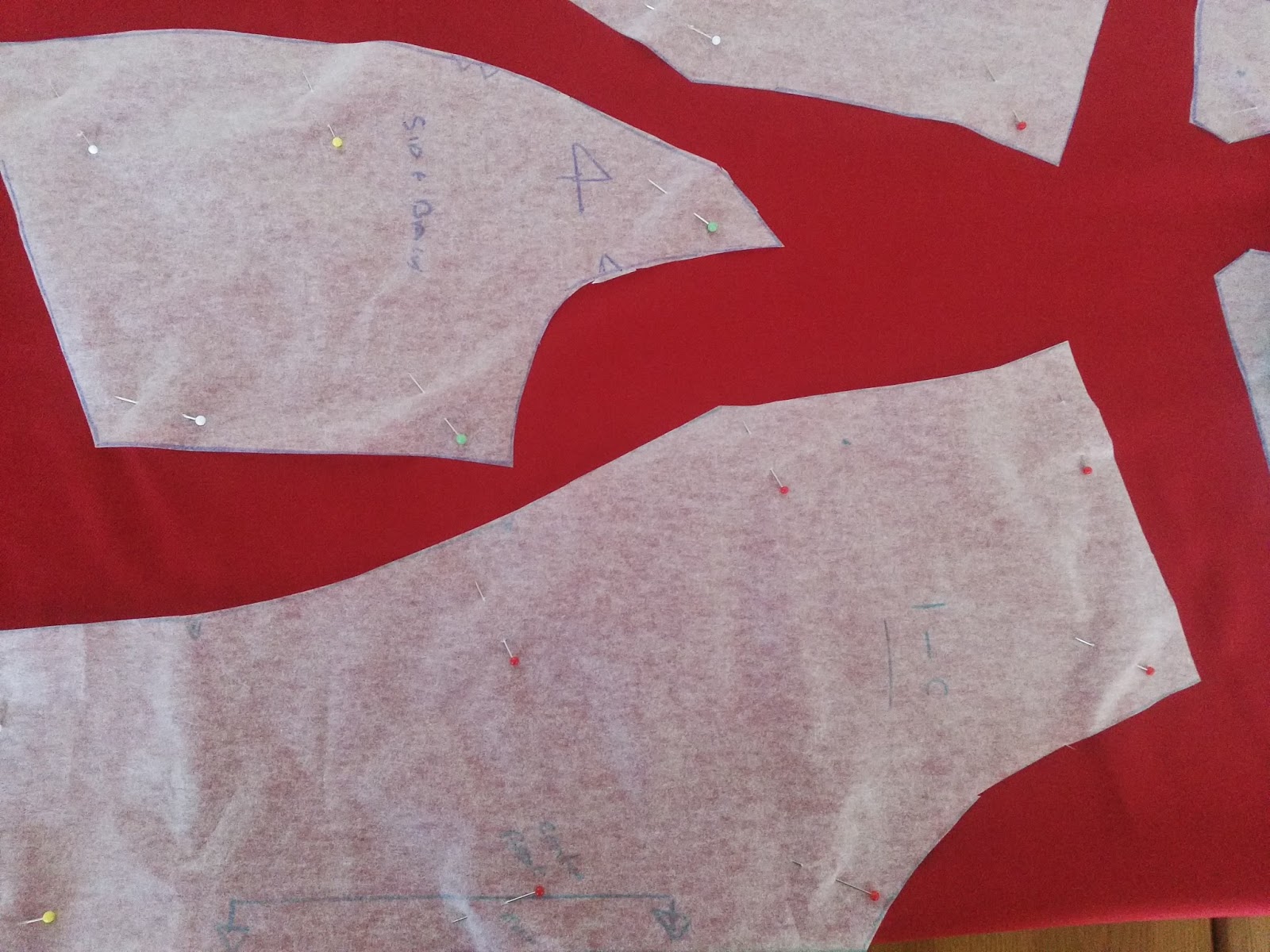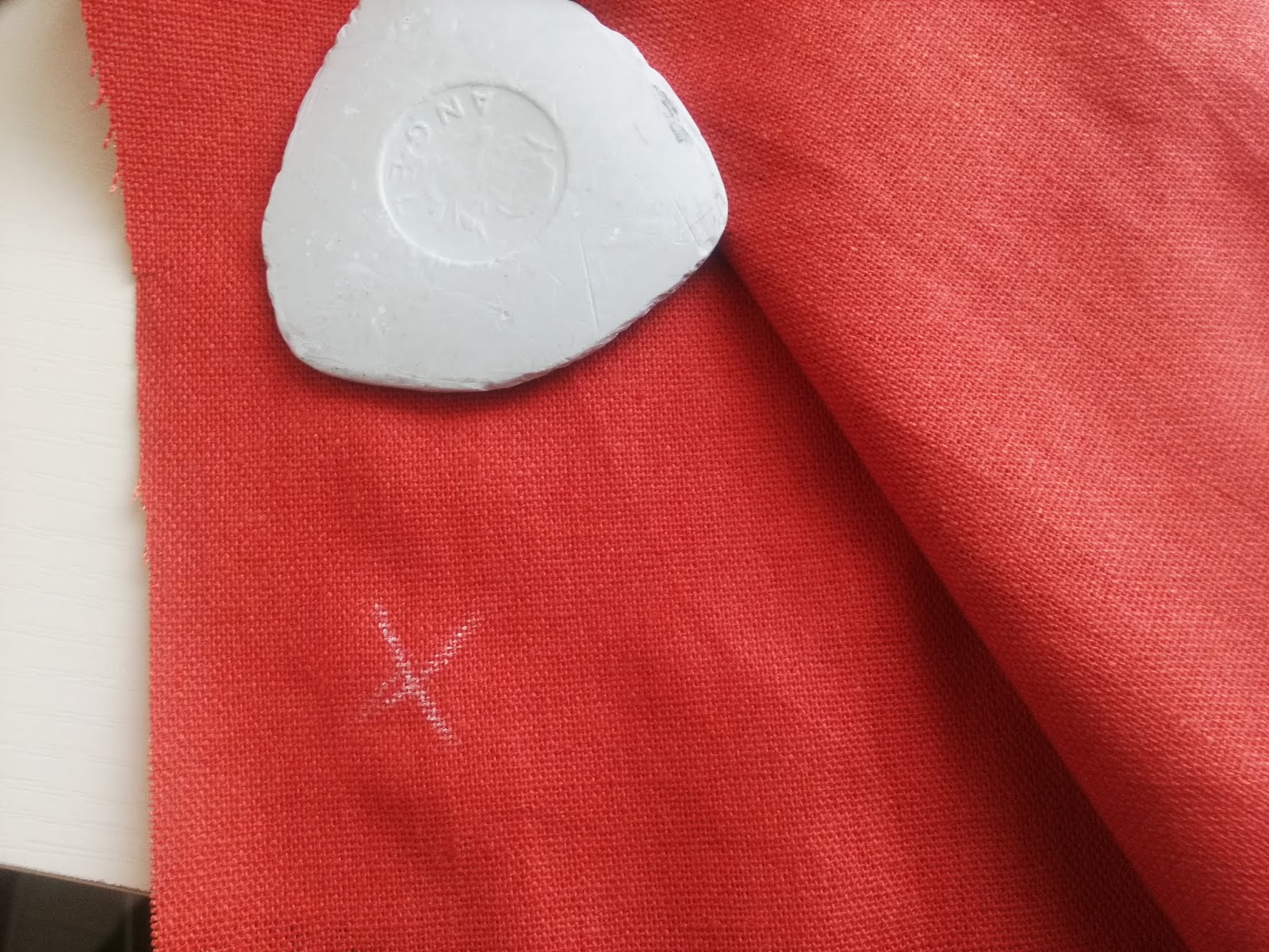 The fabric looks similar on the right and wrong sides so to make sewing the garment easier I used a cross in ordinary Tailors chalk on the wrong side of each piece.