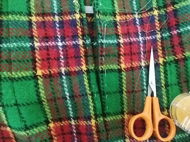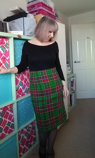 This fabric is pure wool and cannot be washed. So do take care to have it professionally cleaned when needed. To prevent you having to clean it often check it over for stains every time you wear it and remove them with a suitable product. Give it a shake and a gentle brush and hang it up overnight to air before putting it back in your wardrobe.To shrink the fabric before cutting out very carefully press it by pressing , not ironing ( IE placing the iron onto the fabric and lifting it immediately) over a damp pressing cloth and moving along the entire width and length of the fabric. Allow it to dry naturally.Do make sure to mark which direction your Tartan on design runs and mark the back with Tailors Chalk.Meanwhile choose a skirt pattern , A pencil skirt with few seams such as McCall's Pencil Skirt is ideal.While your fabric is drying make a toile or test garment - this a vital step when making something as special as this, so don't skip it. When you have made your toile, make any adjustments and take it apart again . Press the pieces and mark the darts and seam lines with a permanent marker. You can then either transfer all the markings onto the tissue paper pattern or use the toile.The toile can be kept and used many times, each time tacking it together and trying it on to ensure it still fits. I have been using mine for a couple of years, each time using it as the basis for a new skirt. I alter the length, add kick pleats or vents, it is very versatile.