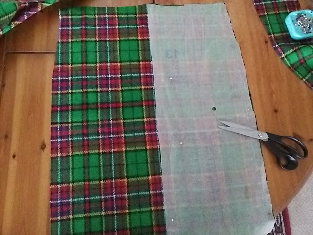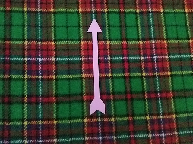 Any fabric with a large design needs careful pattern matching. I studied my Tartan for a while and decided that the red squares caught my eye first and that they should feature exacly along the centre front line. I also needed to take the hemline into account as I wanted the green to sit at the lower hemline.The fabric needs to be cut out in a single layer so as not to distort the design. The front pattern is pinned into place with the fold line along the centre of my red square part of the design and drawn around with tailors chalk. Then the pattern is flipped along the centre front and the other side is marked and then cut out. The front should be in one piece.Cut out one back, matching the diagonal lines and flip the pattern over and cut another back.Try to pattern match the bottom of the skirt side seams to make it as pleasing to the eye as possible. NB Once curves and darts come into play you will not get a pattern match the full length of the seam