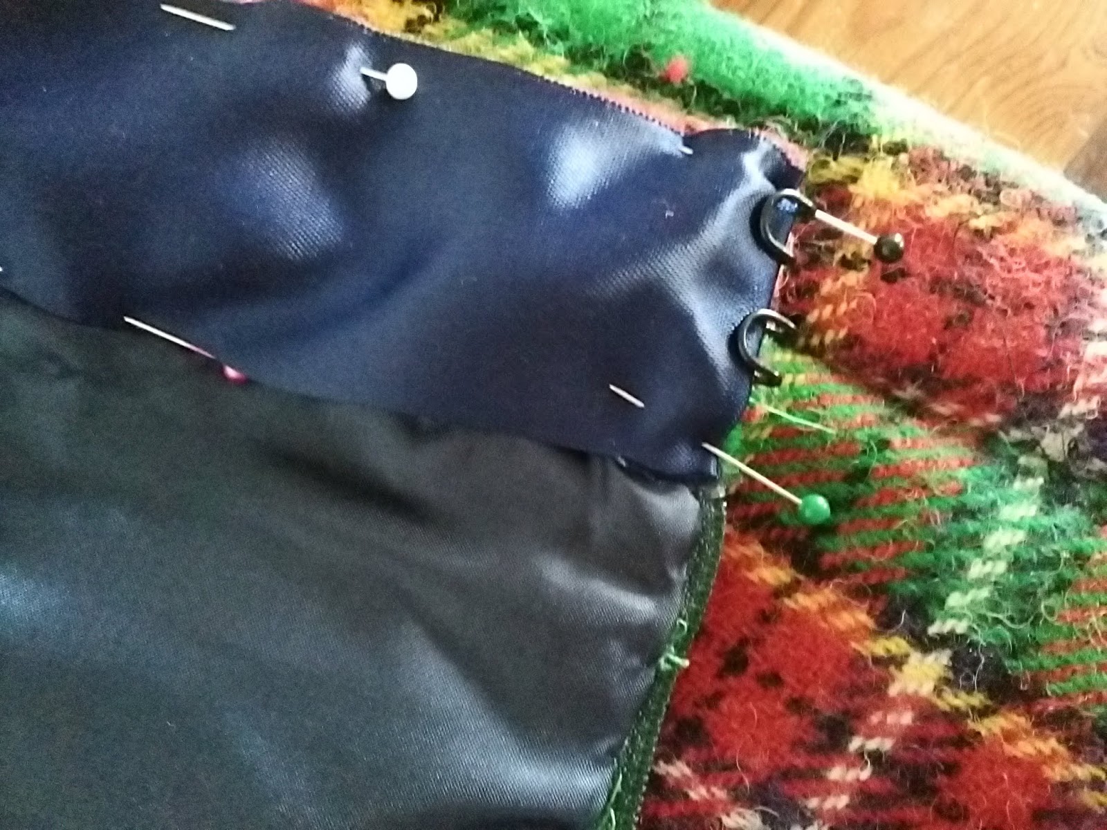 Sew large hooks and eyes to the edges of the waistband on the inside using waxed thread. The edges of the waistband should meet exactly when the fasteners are closed.Cut lining fabric to the correct width adding seam allowances which are turned under and pressed flat.The facing should cover the hooks and eyes leaving the working parts only visible.