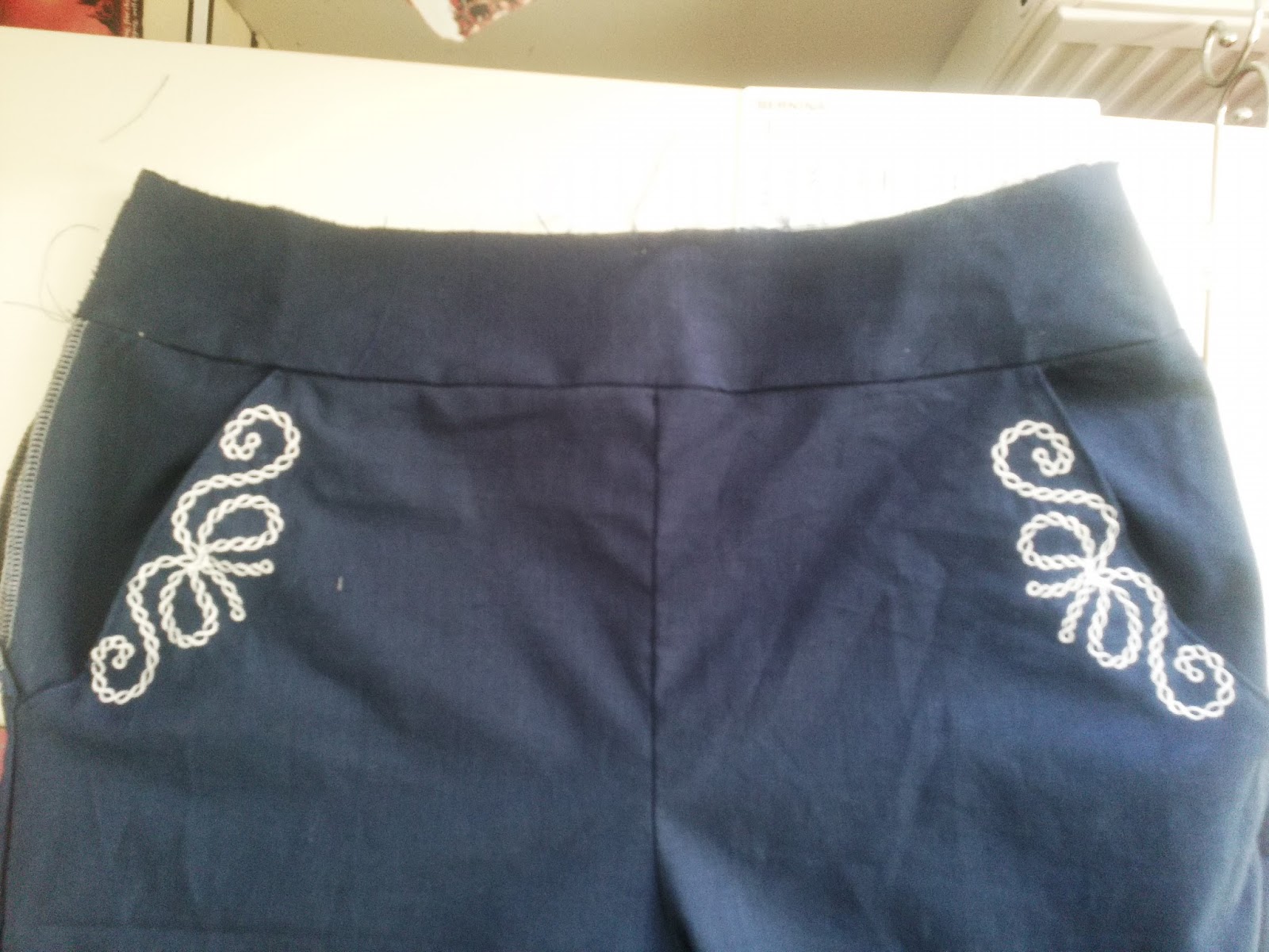 After completing the first row along the bottom of each trouser leg continue with as many rows of pintucks as you want, it is better to have pintucks along the whole depth of the hem to hold it neatly in place. You can see the slightly raised effect of the pintucks on the photo above.