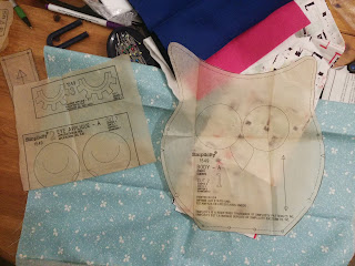 Cut the main pieces out from your chosen fabric and before you cut the eyes and beak and eyelashes out of felt, you need to back the felt with some Bondaweb see it here -  Bondaweb if you cut out pieces of felt roughly the right size you can then trace the shapes directly onto the paper backing making it much easier to handle. Iron the Bondaweb onto the felt. Draw the shapes and then cut out. Peel off the paper backing and then iron in place. This binding is wonderful for all sorts of projects.