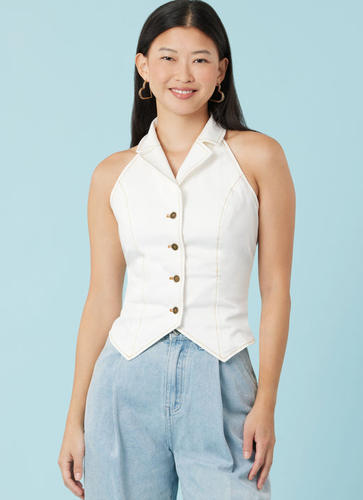 View full detailsSimplicity sewing pattern for Vest style tops have button-front closure and lining. View B has contrast on the sides. Views C and D are halter vest...