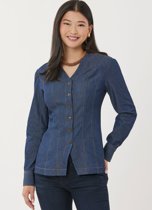 Simplicity sewing pattern for Denim button front shirt with V neckline has seam details and sleeve variations. View A shirt has sleeveless armholes...