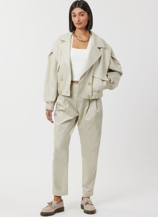 View full detailsSimplicity sewing pattern for Double breasted jacket has shoulder flange, front pockets with flaps and elastic at sleeves and hem. Cropped pants wi...
