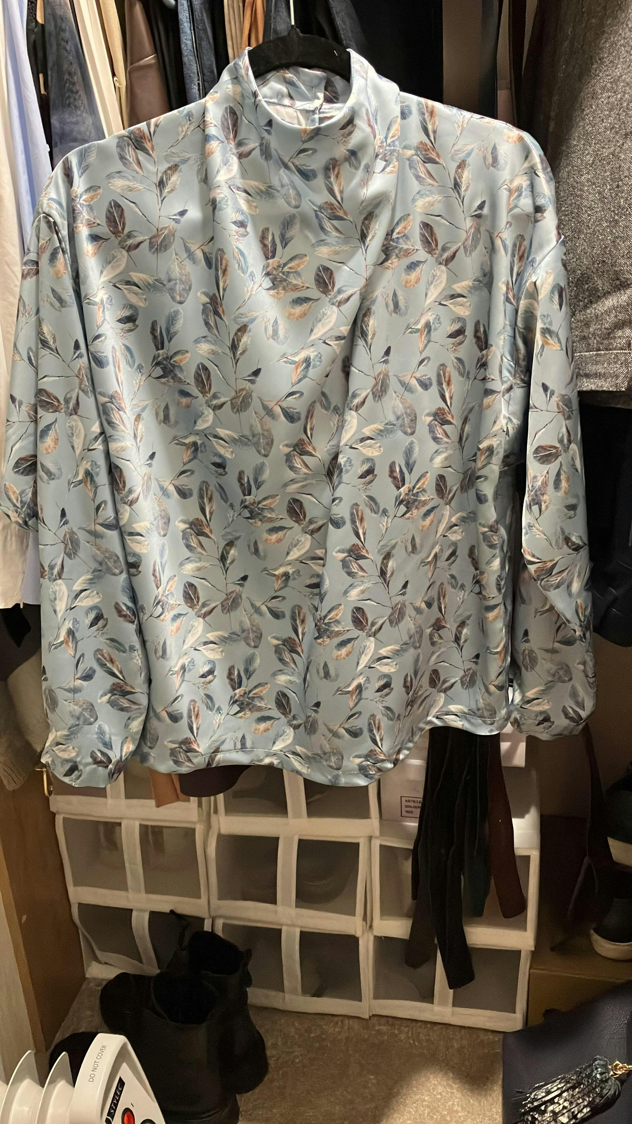 Very loose-fitting, pullover blouse has bias draped front, dropped shoulders, back neckline slit with buttons and loops, short or long sleeves with buttoned pleat at lower edge (push up), and narrow hem.