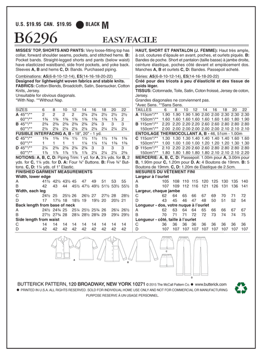 MISSES' TOP, SHORTS AND PANTS: Very loose-fitting top has collar, forward shoulder seams, pockets, and stitched hems. B: Pocket bands. Straight-leg shorts and pants (below waist) have elasticized waistband, side-front pockets, and yoke back. Sleeves A, B and hems C, D: Bands. Purchased piping. Designed for lightweight woven fabrics and stable knits. FABRICS: Cotton Blends, Broadcloth, Satins, Seersucker, Cotton Knits, Jerseys. *With Nap. **Without Nap. Unsuitable for obvious diagonals. NOTIONS: A, B, C, D: Piping Trim: 1 yd. for A, 31/4 yds. for B, 2 yds. for C, 11/4 yds. for D. A: Four 3/4" Buttons. B: Five 3/4" Buttons. C, D: 11/4 yds. of 1" Elastic. Size Combinations: A5(6-8-10-12-14), E5(14-16-18-20-22)