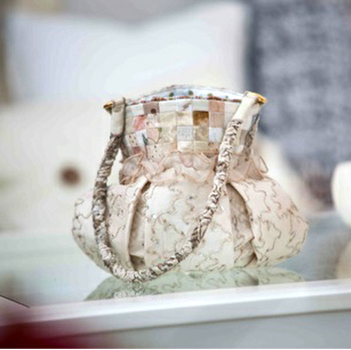 1. Cut the fabrics in squares using a rotary fabric cutter. Arrange the design on the Quilter’s Grid (adhesive facing up) and iron on dry with light pressure for 10–12 seconds.