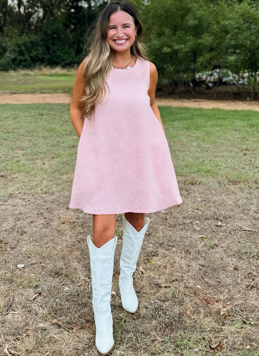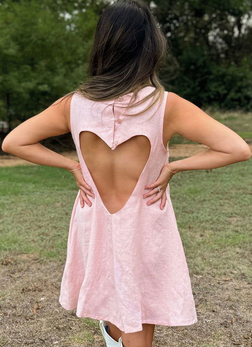 Sewing Pattern for A-line sleeveless or short puff sleeve mini dress has heart cutout detail on the back with optional ruffle lace trim, bust darts, side seam pockets and button and elastic loop closure on the back of dress.