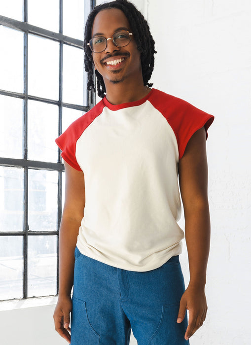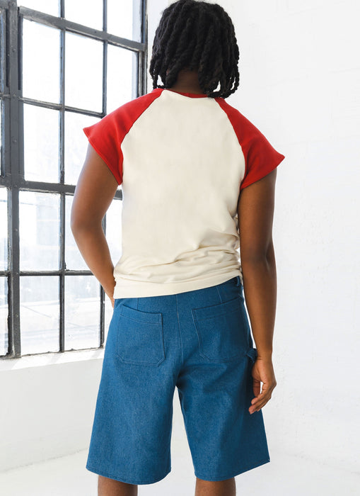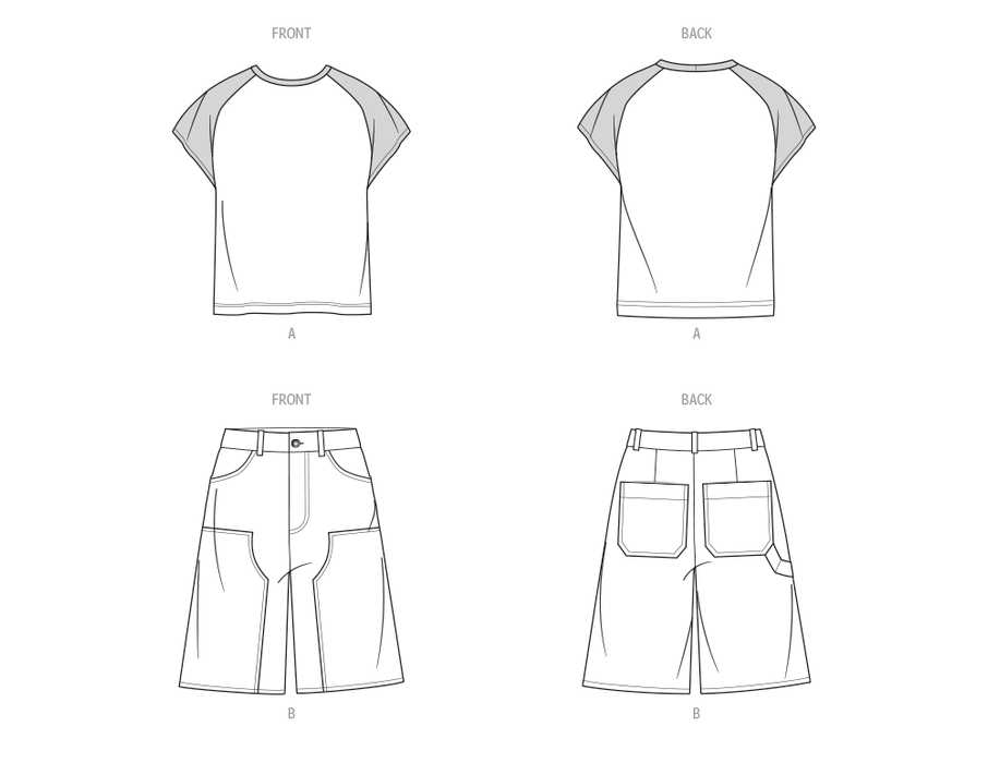 Sewing pattern for T-shirt with contrast raglan sleeves and neckband. Knee length shorts have front patches, waistband with belt loops and button closure, fly front zipper and pockets.