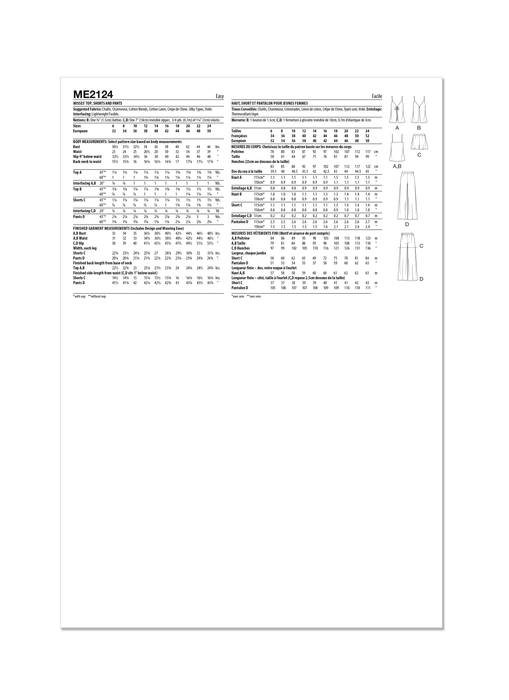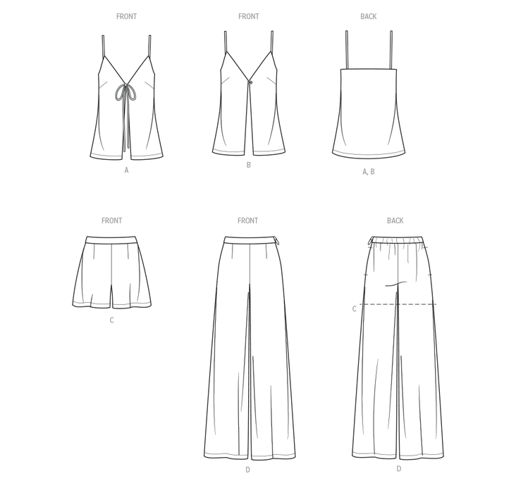 Sewing pattern for V-neck tops have tied front or front button opening, spaghetti straps and bust darts. Shorts and pants have waistband, side seam pockets and invisible zipper closure.