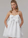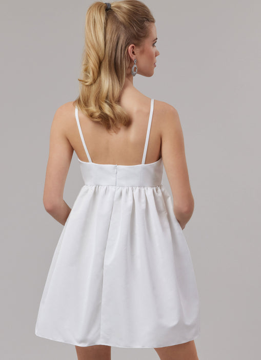 McCall's sewing pattern for Empire waist dress, close-fitting through bust, has sweetheart neckline, double bow front, lined bodice and narrow straps. Full skirt has side front pockets, no side seams. Invisible back zipper and unlined skirt.