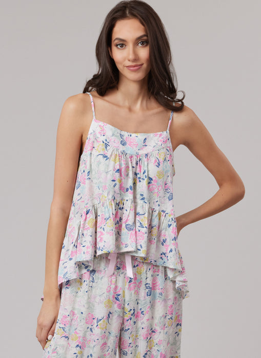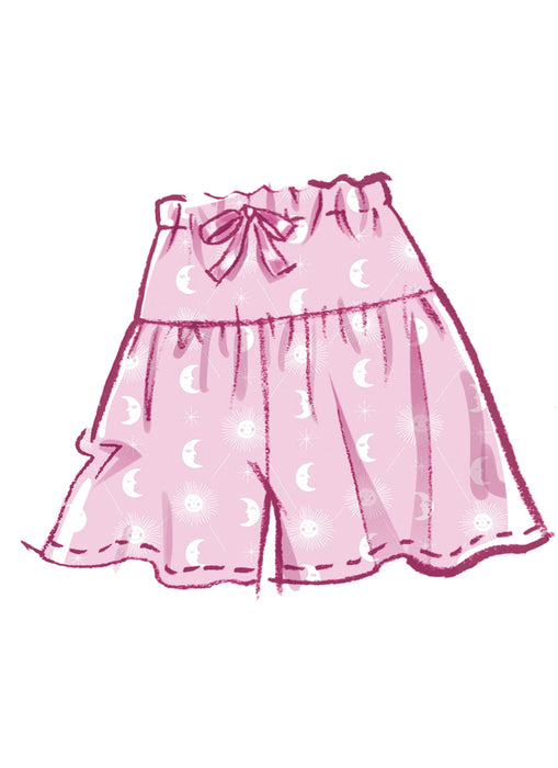 McCall's sewing pattern for Stylish lounge set includes top, shorts and pants. Top has spaghetti straps, ruffles, high-low hem and bias tape finish at armhole. Tiered balloon pants have ribbon ties.