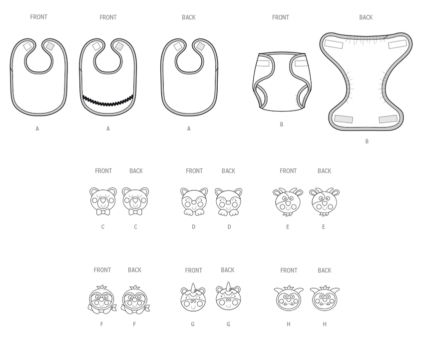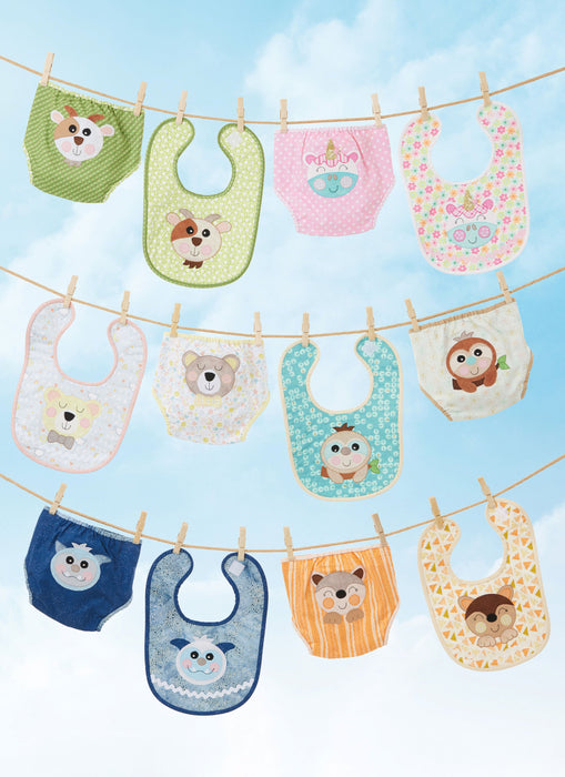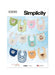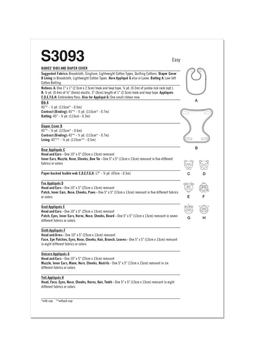 Simplicity sewing pattern for Sew Sweet Chic by Susan Cousineau. Lightly padded bib has hook and loop closure, contrast binding and optional rick rack trim. Lined diaper cover has lightly elasticized leg edges for snug fit, adjustable hook and loop closures at waist and contrast binding. Bibs and diaper covers can be embellished with adorable bear, fox, goat, sloth, unicorn or yeti appliques. See envelope for more information.
