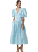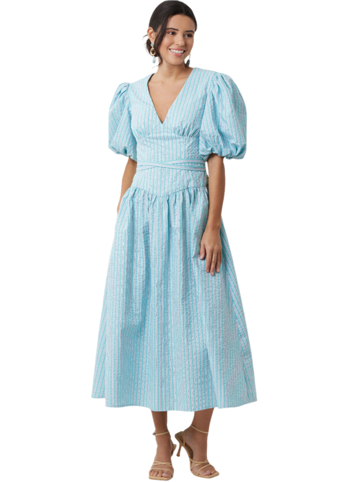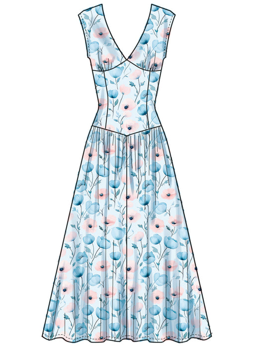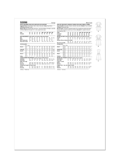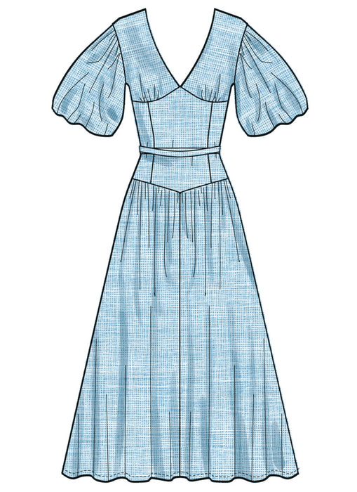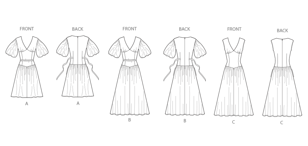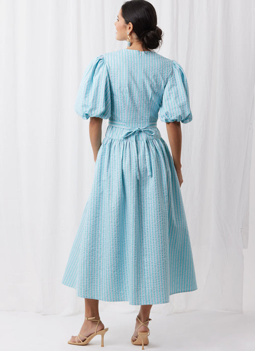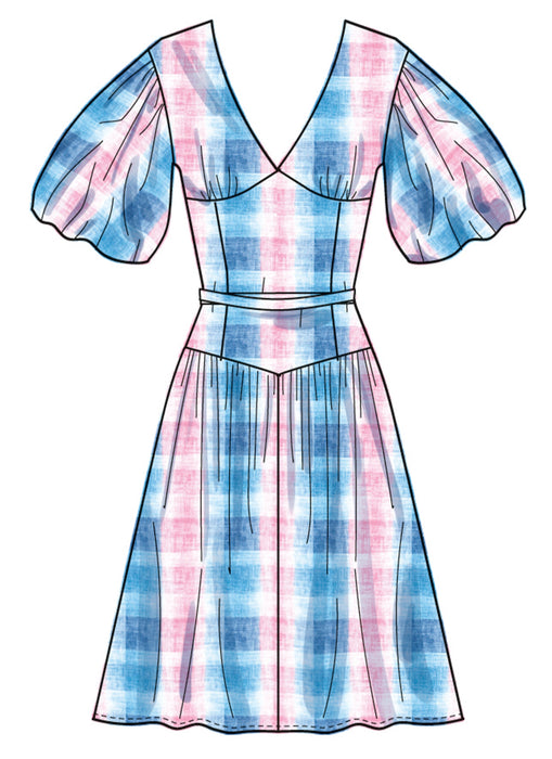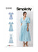 Simplicity sewing pattern for Fit and Flare dress have surplice V-neck, gathers at skirt, side pockets, narrow hem and invisible back zipper closure. Views A and B have dropped shoulders, bubble sleeves and self-ties inserted into back darts. View D dress is sleeveless armholes finished with bias tape.