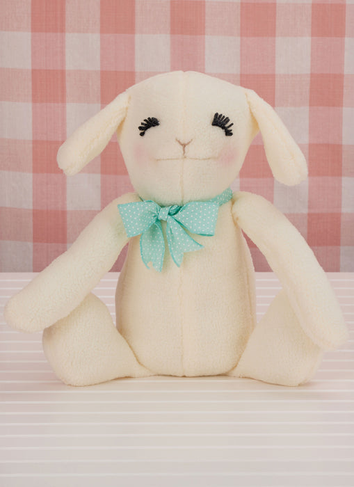 Sewing pattern for Easy to sew 15" (38cm) tall seated plush animals have long floppy arms, sweet smiling faces, appliqued eyelashes, ribbon neck bows and simple two-main-pattern-piece construction. Lamb and bunny have embroidered noses; bear and puppy have nose appliques. Puppy has contrast face and belly appliques. See envelope for more information.