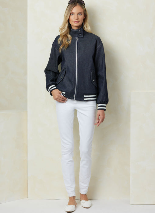 Sewing pattern for Loose fit jackets with front zipper opening have stand collar with buttons, dropped shoulders, long sleeves with cuffs and welt pockets with flaps and button detail. View A has adjustable tabs at waistband. View B has purchased rib trim at the cuffs and waistband.