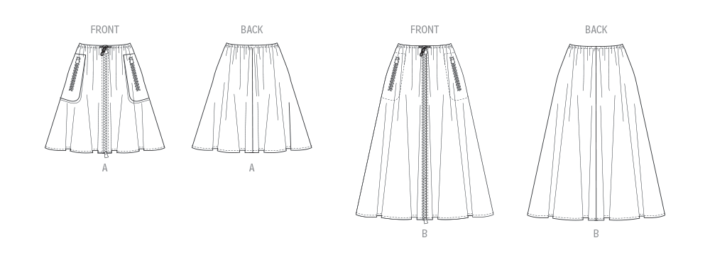 Sewing pattern for Fully pleated circle skirt has front zipper opening, drawstring waist, zip-fastening pockets and length variations.